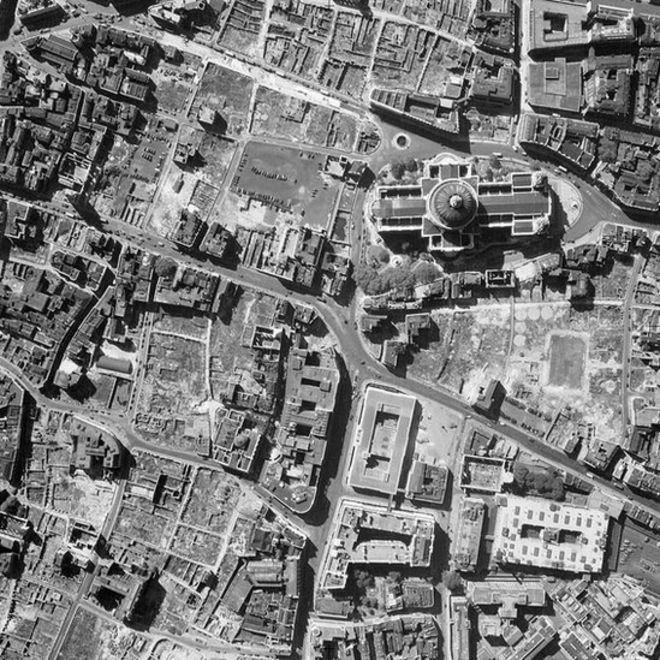 Rubble and burnt out buildings surround St Paul's Cathedral, September 1940.