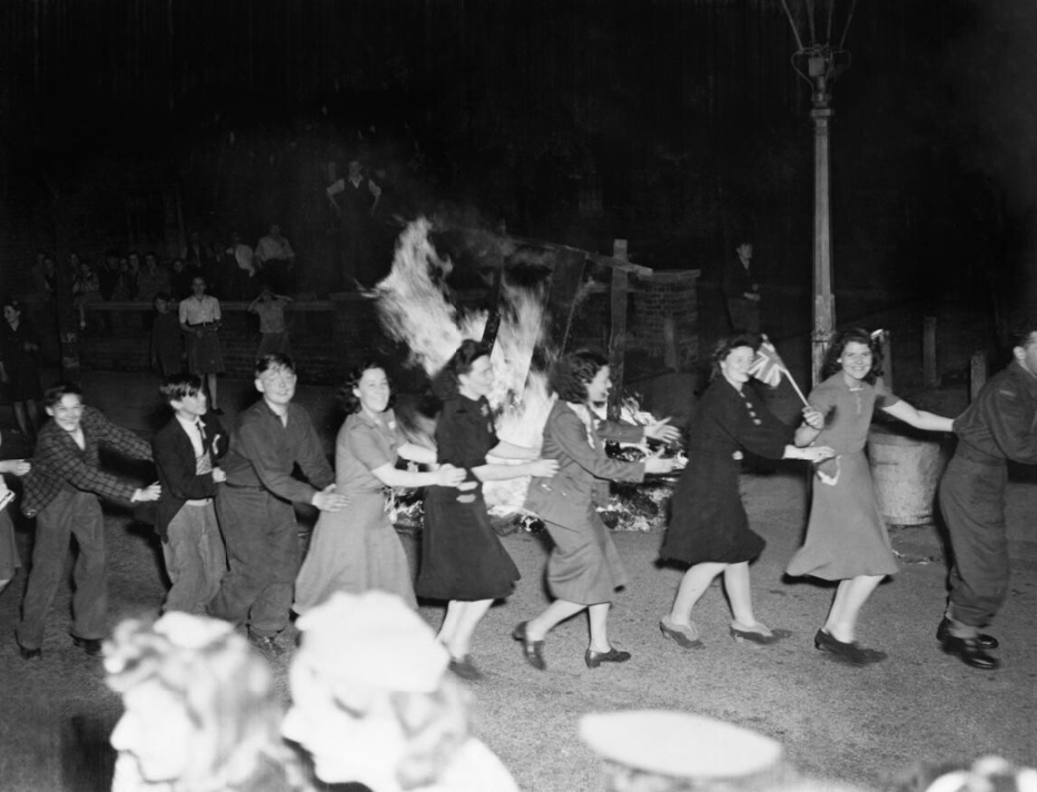 Men and women dance the conga around a bonfire in East Acton, London during the evening of VE Day, 8 May 1945.