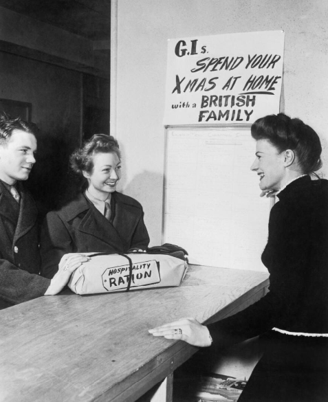 A sign at a Red Cross Club reads 'Spend your Xmas at home with a British Family'.