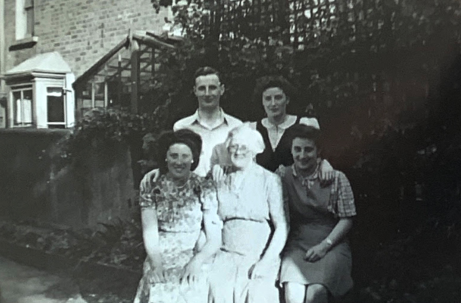 The Monk family in full force, 1945. In the garden of Shenley Road.